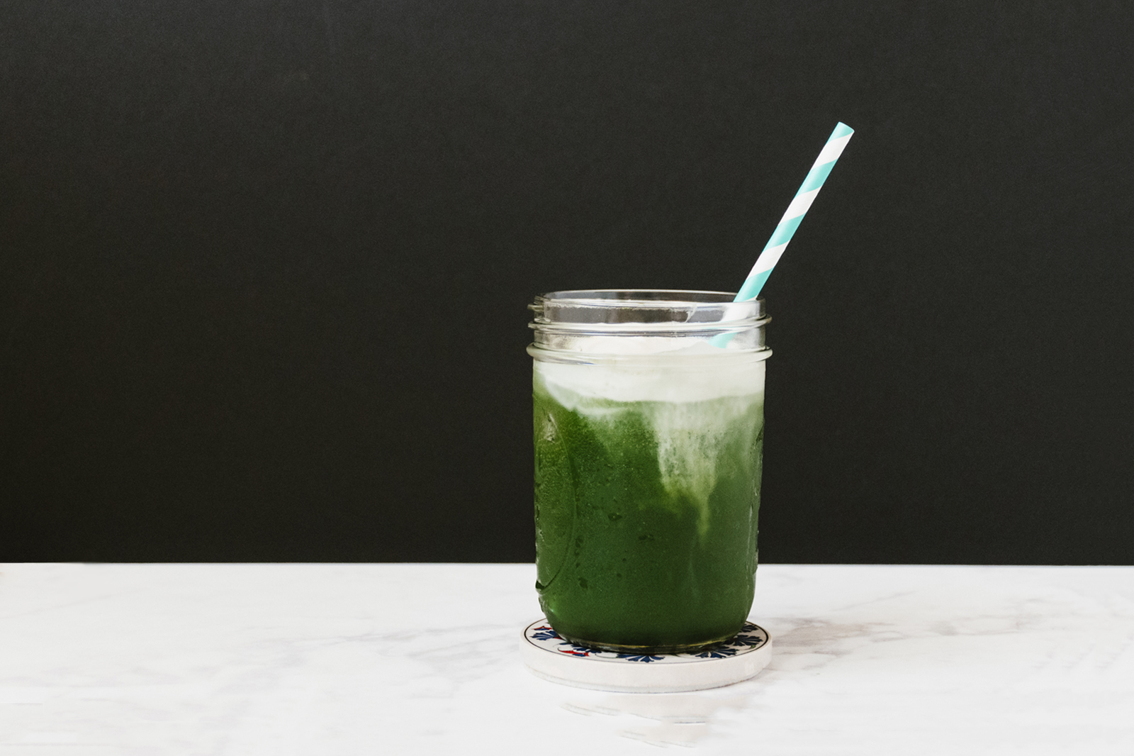 Put ice cubes in the 16 oz glass jar and add sparkling mineral water. Pour matcha paste slowly into the sparkling water and stir to mix.