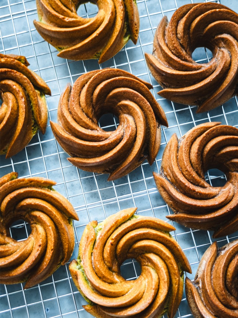 If you’re baking a split flavor batch, observe if the baking time is different for each ingredient. For example, I noticed when I baked a matcha and black sesame split (mini bundt cake) batch recently, that the matcha version finished baking a few minutes ahead of the black sesame. Make a note of the baking time for each flavor ingredient you use.