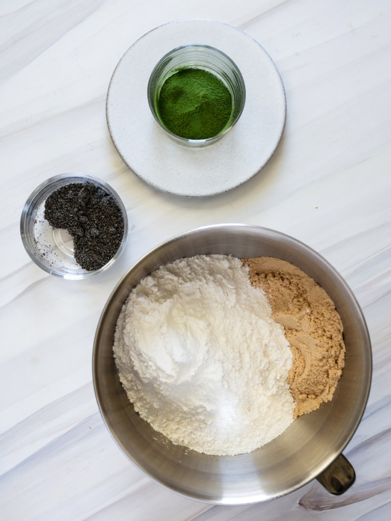 Combine dry ingredients (glutinous rice flour, matcha, sugar, and salt) in the bowl of a stand mixer, or a large mixing bowl, and stir together.